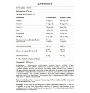 Glukozamina chlorowodorowa - glukozamina to kluczowy element mazi stawowej. Brak odpowiedniej ilości glukozaminy powoduje zmniejszenie gęstości mazi, co sprawia, że stawy są gorzej “nasmarowane” i bardziej narażone na uszkodzenia. Dostarczenie organizmowi odpowiedniej ilości glukozaminy za pomocą suplementacji diety pobudza produkcję mazi stawowej.